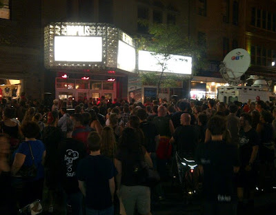 After killing a poor stage hand, throwing a molotov cocktail at the back entrance, and trying to shoot-up the PQ victory party.